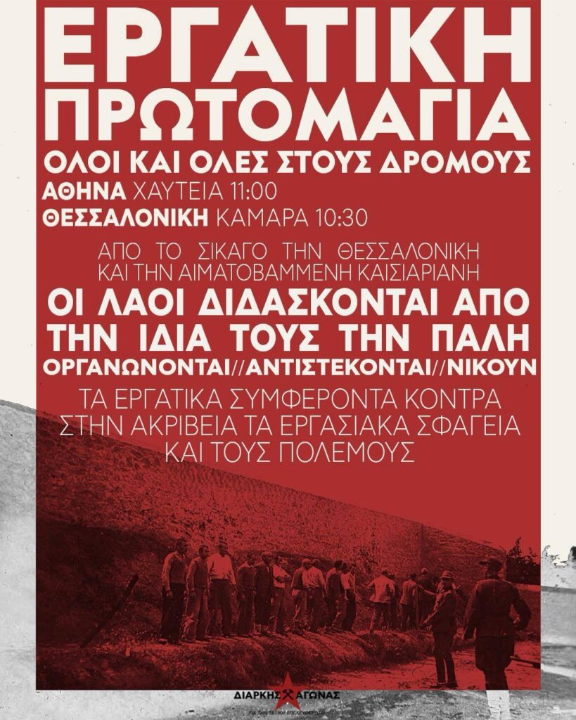 Η φετινή Πρωτομαγιά μας υπενθυμίζει τα δικά μας καθήκοντα, αυτά της εποχής μας. Μας υπενθυμίζει ότι ο εχθρός βρίσκεται μέσα στην ίδια μας την χώρα, μέσα στο ΝΑΤΟ, μέσα στην Ε.Ε. Το χρέος μας να μετουσιώσουμε τη λαϊκή αυτή αντίδραση σε οργανωμένο αγώνα ενάντια στο κεφάλαιο και το κράτος του, να συνεχίσουμε τη μοριακή δουλειά στους χώρους εργασίας μας, δημιουργώντας και ενισχύοντας τα ταξικά σωματεία. Να οργανώσουμε μαζικές και μαχητικές απεργίες, διεκδικώντας μισθούς στο ύψος των αναγκών μας και αξιοπρεπείς όρους διαβίωσης ενάντια στην πολεμική οικονομία και την μετατροπή της χώρας σε ορμητήριο του ΝΑΤΟ. Να συγκρουστούμε με τις ξεπουλημένες εργοδοτικές ηγεσίες και να στήσουμε αναχώματα στην εντεινόμενη επίθεση στα εργασιακά δικαιώματα και στο συνδικαλισμό. Να οργανωθούμε σε κάθε κοινωνικό και ταξικό πεδίο για να απαιτήσουμε στέγαση για όλους και όλες, δωρεάν παιδεία και υγεία. Να βάλουμε φρένο στις πολιτικές της εξαθλίωσης του κεφαλαίου, στα ιμπεριαλιστικά εγκλήματα, στη γενοκτονία του Παλαιστινιακού λαού. Να επιβάλλουμε δικαίωση για τις χιλιάδες εργατικές δολοφονίες και τα θύματα των δολοφονικών πολιτικών του καπιταλιστικού συστήματος στα εργασιακά κάτεργα, στα σύνορα και στις ράγες της ανάπτυξης.