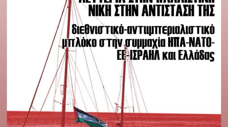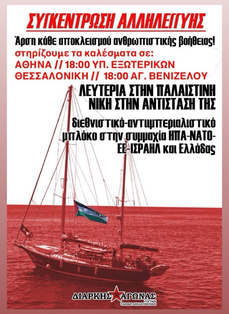 Στηρίζουμε το κάλεσμα σε συγκέντρωση διαμαρτυρίας στις 18:00 στο Υπουργείο Εξωτερικών στην Αθήνα και στο άγαλμα Βενιζέλου στην Θεσσαλονίκη, για να καταγγείλουμε την παράνομη αναχαίτηση πλοίων του στόλου από τον ισραηλινό στρατό σε διεθνή ύδατα, να πιέσουμε διασφαλιστεί η ασφαλής δίοδος των πλοίων του στόλου, να καταδείξουμε την προκείμενη ευθύνη του ελληνικού κράτους, καθώς αναχαιτήσεις έγιναν εντός της ζώνης Έρευνας και Διάσωσης (SAR), για την οποία το ελληνικό Λιμενικό και κατ’ επέκταση το ελληνικό κράτος φέρει ευθύνη, αλλά και την γενικότερη επαίσχυντη και επικίνδυνη στάση της ελληνικής κυβέρνησης, η οποία εκτός από διεθνής απολογητής των εγκλημάτων του σιωνιστικού μορφώματος αποτελεί αρωγό-ακόλουθο του Ισραήλ και των Η.Π.Α., εκφραστή και ενορχηστρωτή της ιμπεριαλιστικής τους επιθετικότητας στην ευρύτερη περιοχή.