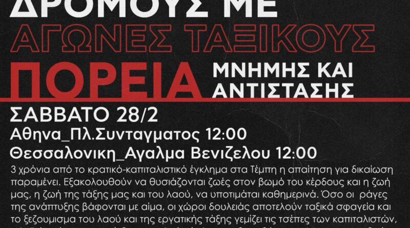 Σήμερα, 3 χρόνια από το κρατικό-καπιταλιστικό έγκλημα στα Τέμπη η απαίτηση για δικαίωση παραμένει. Τρία χρόνια μετά εξακολουθούν να θυσιάζονται ζωές στον βωμό του κέρδους και η ζωή μας, η ζωή της τάξης μας και του λαού, να υποτιμάται καθημερινά για τα συμφέροντα της αστικής τάξης.
