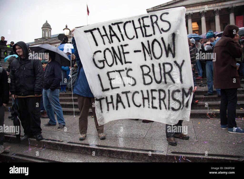 Απέναντι στην επίσημη αγιογραφία, η πραγματικότητα που βίωσε ο λαός, εκφράστηκε με έναν εντελώς διαφορετικό τρόπο. Σε εργατικές περιοχές της Αγγλία και της Σκωτίας, ο θάνατός της δεν προκάλεσε πένθος αλλά πανηγυρισμούς. Στο Μπρίξτον, στη Γλασκώβη και αλλού, άνθρωποι βγήκαν στους δρόμους, όχι για να θρηνήσουν, αλλά για να γιορτάσουν το τέλος της «μάγισσας». Εικόνες που αποτέλεσαν συμπύκνωση της λαϊκής μνήμης και της ταξικής εκμετάλλευσης. Η λαϊκή μνήμη άλλωστε, δεν διαγράφεται με τηλεοπτικά αφιερώματα ούτε με κοινοβουλευτικές φιλοφρονήσεις.